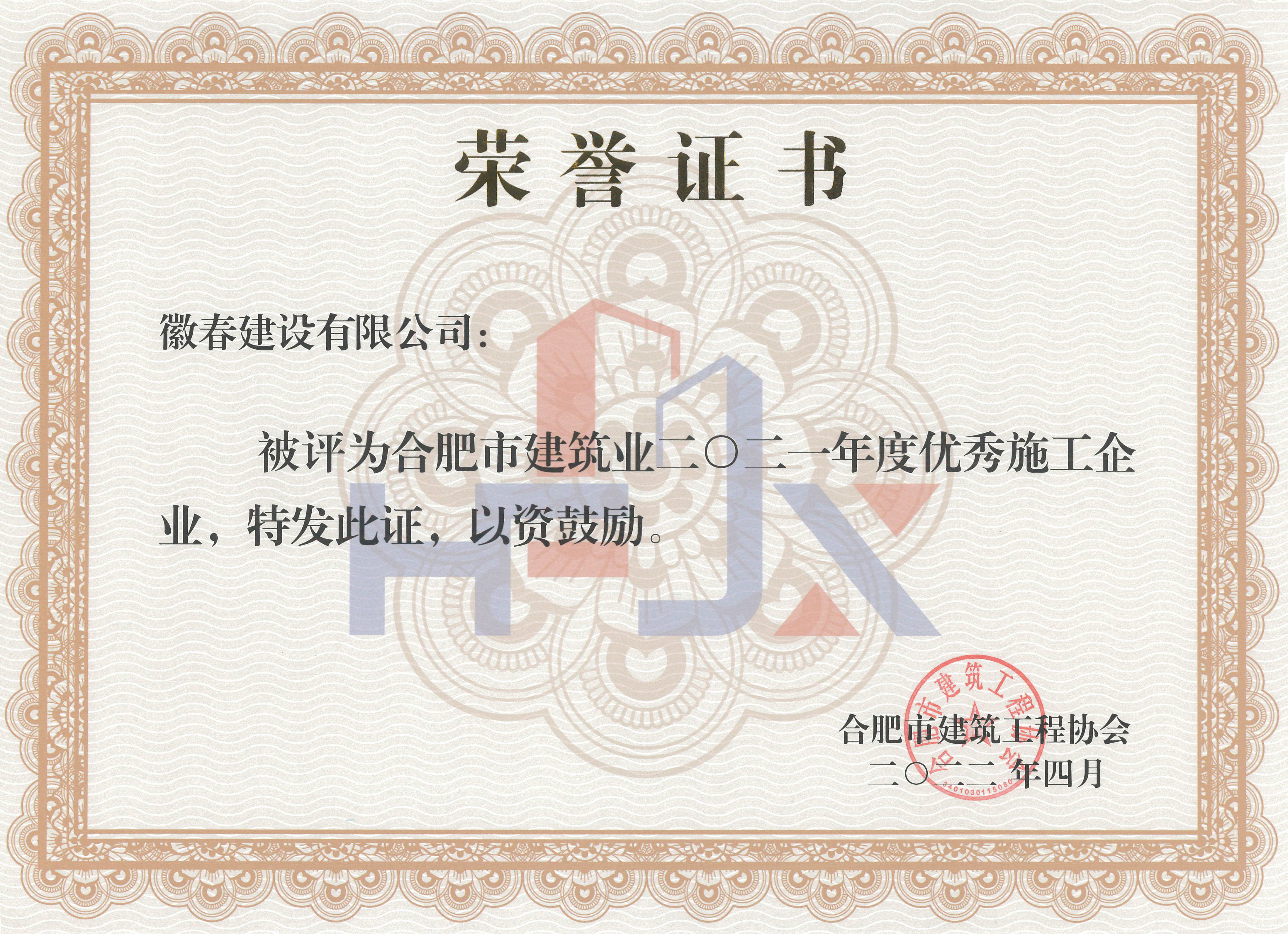 2022年04月13日,合肥市建筑工程协会根据《关于开展2021年度全市建筑业评比表彰活动的通知》(合建协〔2022〕7号)要求,本着“扶强扶优、鼓励成长、客观公正、重在激励”的原则。徽春建设有限公司通过合肥市建筑工程协会党组织的监督,合肥市城乡建设局相关部门把关,被颁发2021年度优秀施工企业称号,刘亿群被评为合肥建筑业2021年度优秀项目经理。