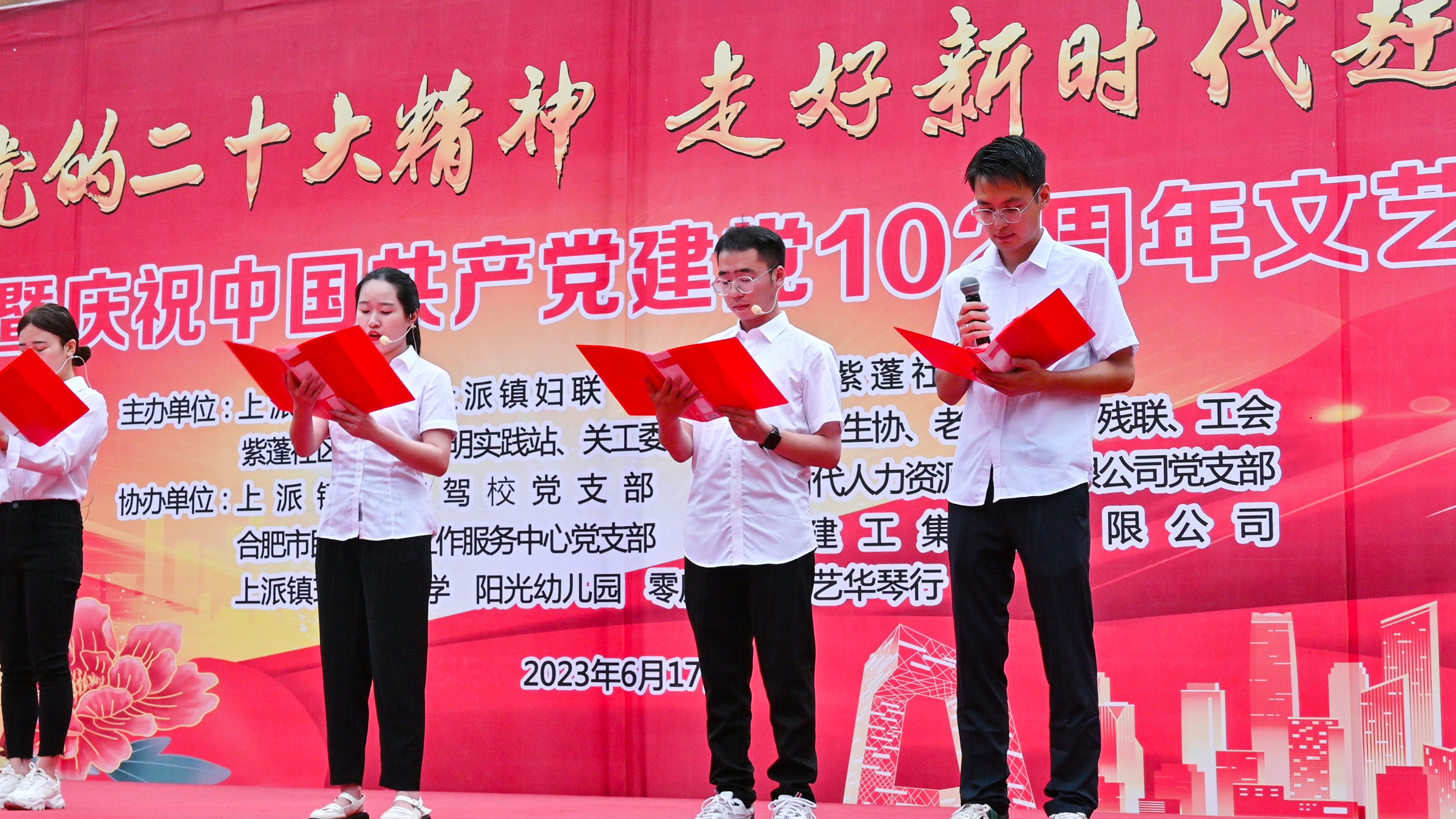 为深入学习贯彻党的二十大精神,庆祝中国共产党建党102周年,传承红色基因,弘扬传统民族文化,营造团结奋进、文明和谐的浓郁氛围。6月17日下午,我单位联合肥西县上派司法所、上派镇妇联、紫蓬社区党委、商圈党总支及辖区单位国安驾校、安徽新时代人力资源管理有限公司、合肥市民欣社会工作服务中心、上派镇珍珠路小学、阳光幼儿园、零度舞蹈、艺华琴行在紫蓬社区凉亭雅苑组织开展主题为“学习党的二十大精神 走好新时代赶考路”的棕享端午暨庆祝中国共产党建党102周年文艺演出活动。