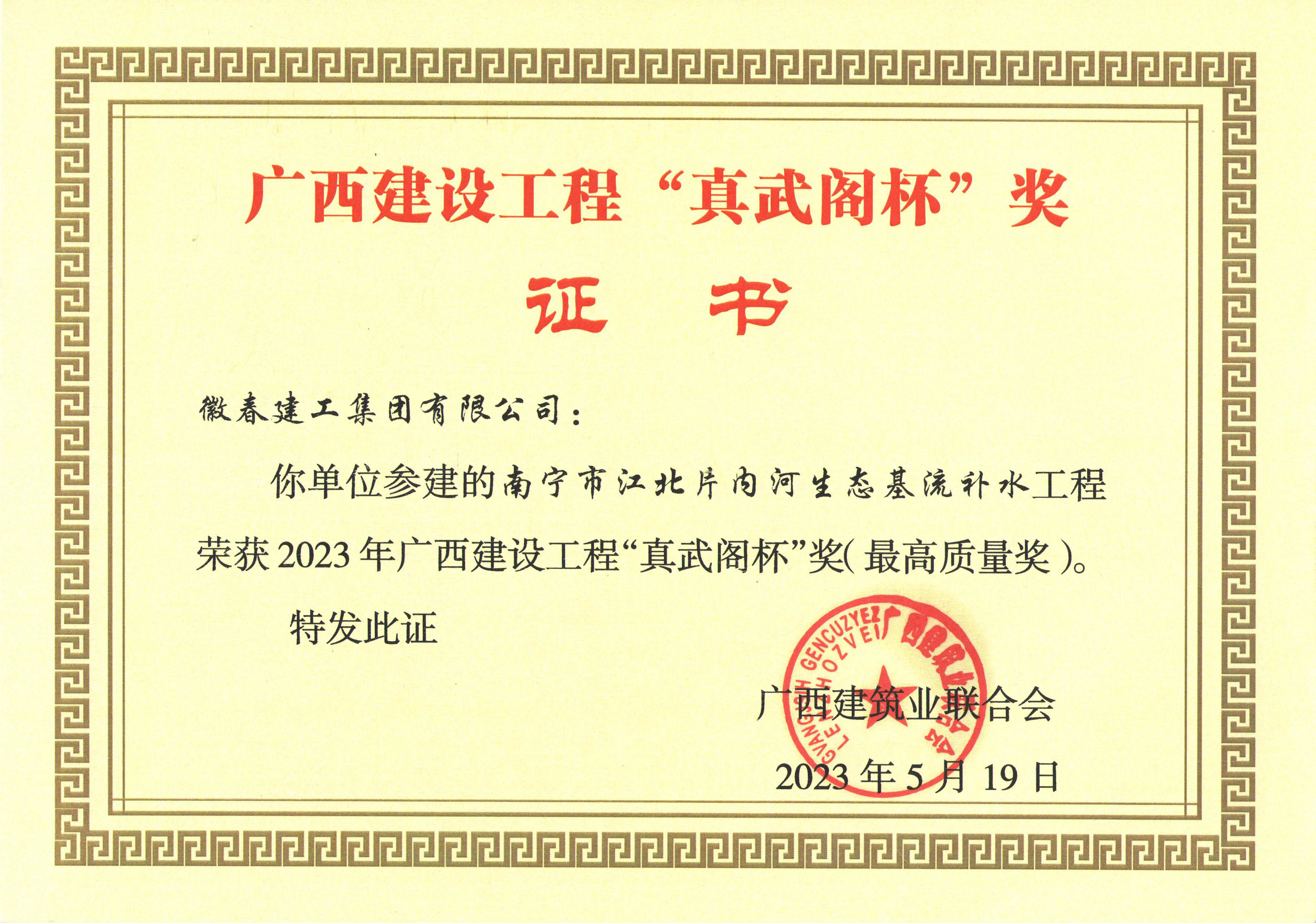 “真武阁杯”是广西建设工程最高质量奖,由广西建筑业联合会组织专家对竣工一年的工程质量进行综合性严格评审,参评的条件是工程必须已获市优质工程奖,质量达到同时期广西建筑行业领先水平。我单位获此殊荣,倍感鼓舞。公司将以此次获评“真武阁杯”奖为契机,不断强化施工现场质量控制环节,用心打造优质工程,持续提升“徽春”品牌,为更加和谐优美的人居环境建设添砖加瓦。